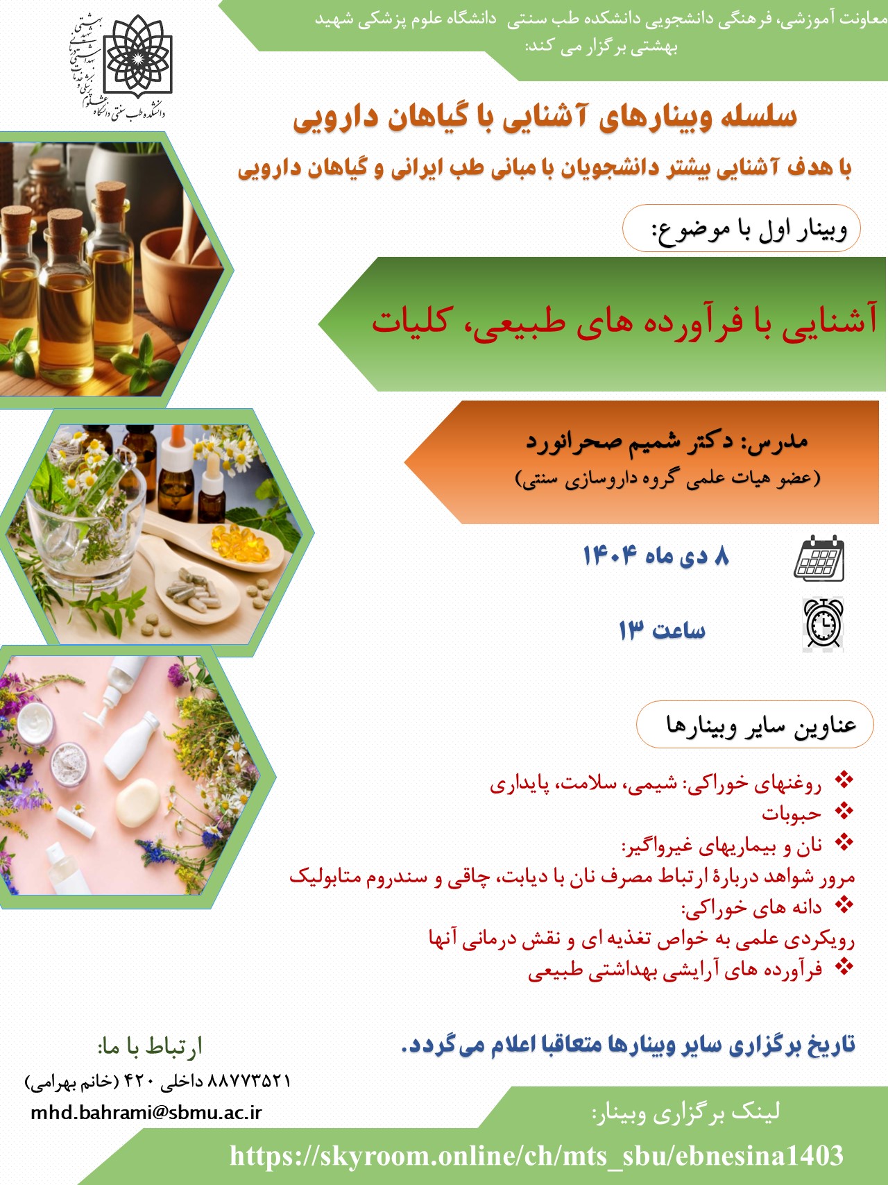 اولین وبینار با عنوان " آشنایی با فراورده های طبیعی ،کلیات" " در تاریخ 8 دی ماه 1404 ساعت 13 برگزارخواهد شد.