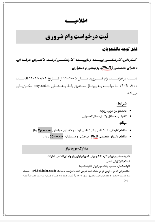 به اطلاع دانشجویان مقاطع کارشناسی، کارشناسی ارشد و دکترای حرفه ای، دکترای تخصصی و پژوهشی و دستیاری می رساند ثبت درخواست وام ضروری سال 1405-1404 از تاریخ 1404/08/04 لغایت 1404/08/11 در پورتال صندوق رفاه به نشانی