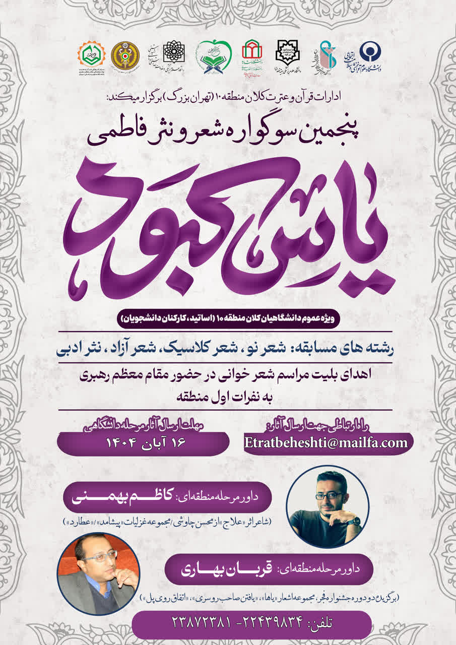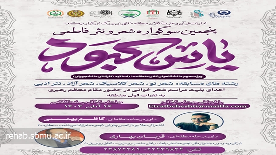 به گزارش روابط عمومی دانشکده پنجمی سوگواره شعر و نثر فاطمی (یاس کبود) ویژه اساتید، دانشجویان و کارمندان دانشگاه  برگزار می گردد. مهلت ارسال آثار به این سوگواره تا 16 آبان ماه می باشد.